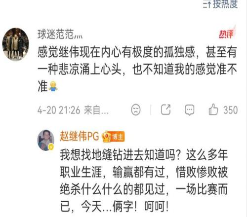 在大比分輸掉比賽之后,趙繼偉在自己的社交媒體上面發了“呵呵”兩個字,并且在評論區回復道“這么多年大勝慘敗絕殺都見過了,但是對于今天這場球,只有呵呵兩個字”,并且在現場可以看到趙繼偉顯得非常的落寞,球隊目前的凝聚力真的太差了,目前這樣的情況下去,遼寧男籃季后賽估計真的一輪游的情況了!